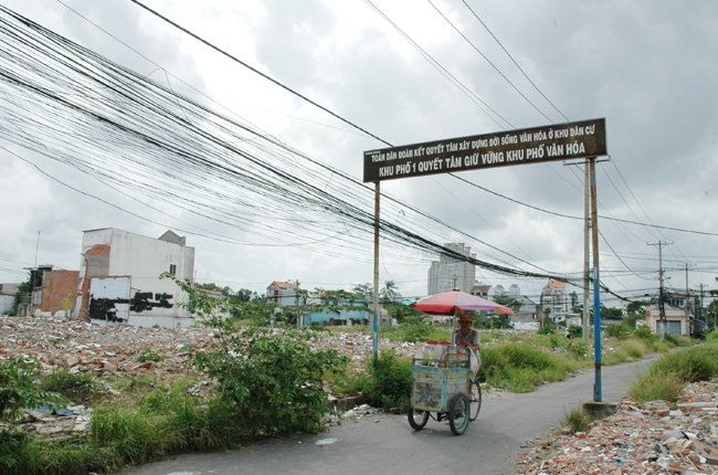 Một người bán hàng rong đang đi qua khu vực giải tỏa, nơi từng là ‘khu phố văn hóa’ tại phường Bình An, một trong năm phường bị giải tỏa để dành đất cho việc phát triển khu đô thị mới Thủ Thiêm